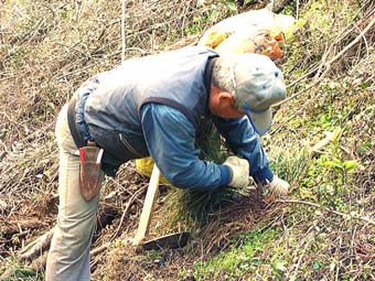 リュウノヒゲが繁殖している畑から分家となるリュウノヒゲを掘り起こしそれを開墾した畑に植えていきます。