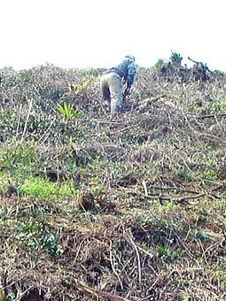 しかし、開墾した土地はいくら刈り取った樹木や雑草が腐食しているとはいえ、足場は悪くおまけに雑草のツルが地上を覆い被さって耕すのを拒んでいるようでなかなかの重労働です。
