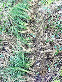 このリュウノヒゲが繁殖していけば、その部分は固着して足場としての役目が出来て、いずれは、段々畑の役目をし、傾斜角のキツイ土地でも農園地として十分使えます。
